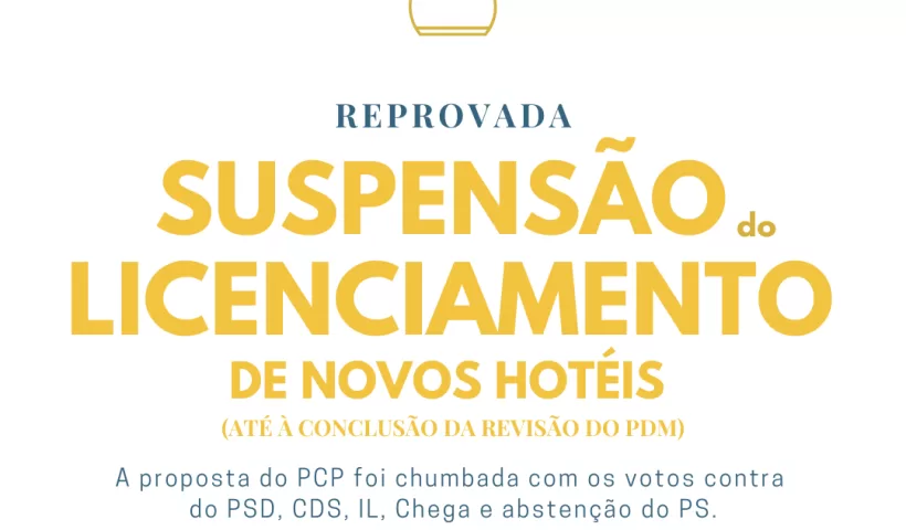 Ler mais Reprovada a suspensão do licenciamento de novos hotéis, até à conclusão da revisão do PDM.Categoria: CML