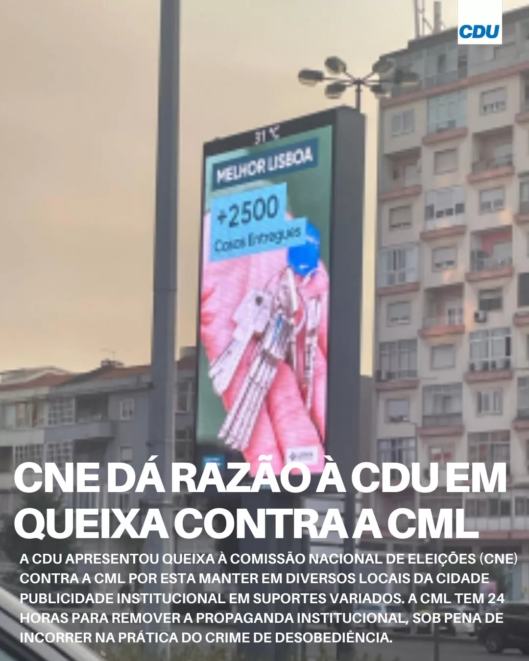 A candidatura da CDU no concelho de Lisboa apresentou queixa à Comissão Nacional de Eleições (CNE) contra a Câmara Municipal de Lisboa (CML) pelo facto de a mesma manter em diversos locais da cidade publicidade institucional em suportes variados.