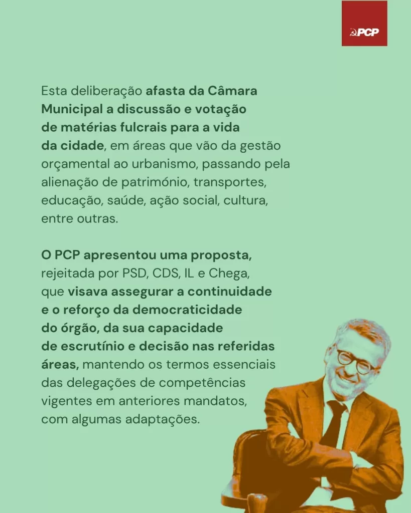 O PCP apresentou uma proposta, rejeitada por PSD, CDS, IL e Chega, que visava assegurar a continuidade e o reforço da democraticidade do órgão, da sua capacidade de escrutínio e decisão nas referidas áreas, mantendo os termos essenciais das delegações de competências vigentes em anteriores mandatos, com algumas adaptações.