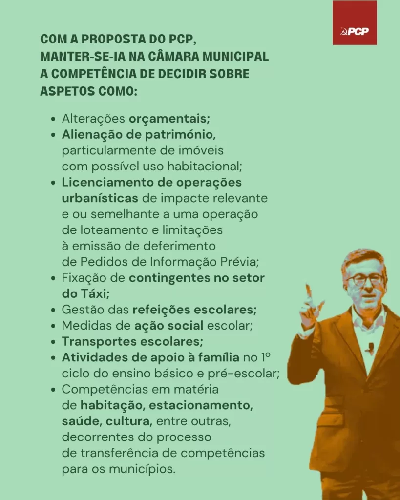 Com a proposta do PCP, manter-se-ia na Câmara Municipal a competência de decidir sobre aspetos como: