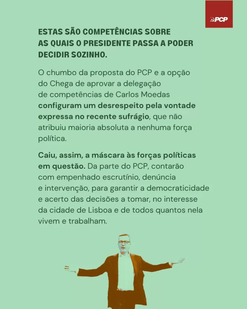 O chumbo da proposta do PCP e a opção do Chega de aprovar a delegação de competências de Carlos Moedas configuram um desrespeito pela vontade expressa no recente sufrágio, que não atribuiu maioria absoluta a nenhuma força política.