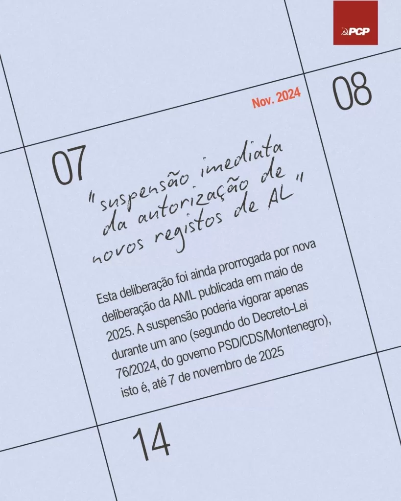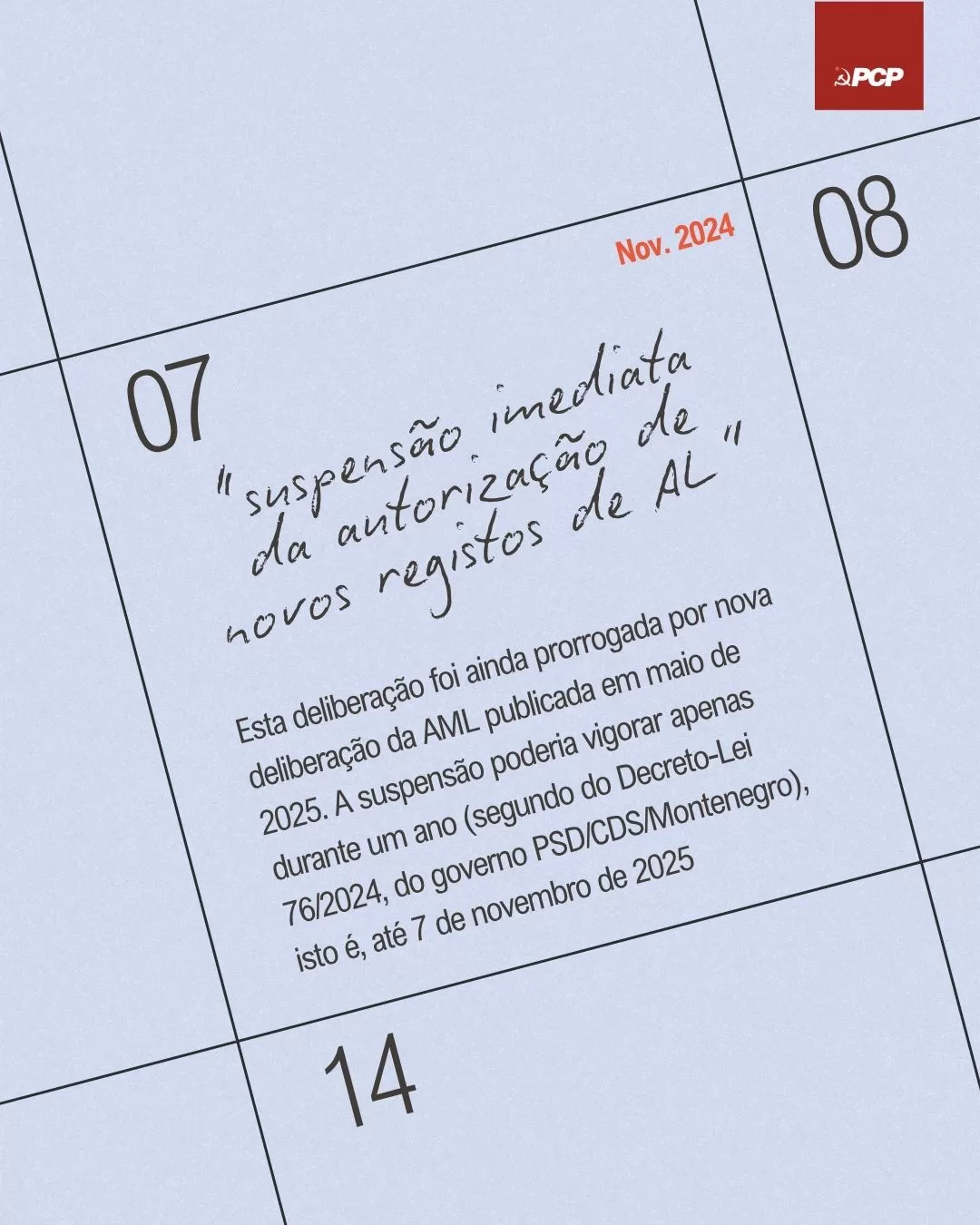 A deliberação da Assembleia Municipal de Lisboa (AML) visando a “suspensão imediata da autorização de novos registos de estabelecimentos de alojamento local, por um prazo de seis meses” foi publicada em Boletim Municipal, a 7 de novembro de 2024. Esta deliberação foi ainda prorrogada por nova deliberação da AML publicada em maio de 2025. A suspensão poderia vigorar apenas durante um ano (segundo do Decreto-Lei 76/2024, do governo PSD/CDS/Montenegro), isto é, até 7 de novembro de 2025.