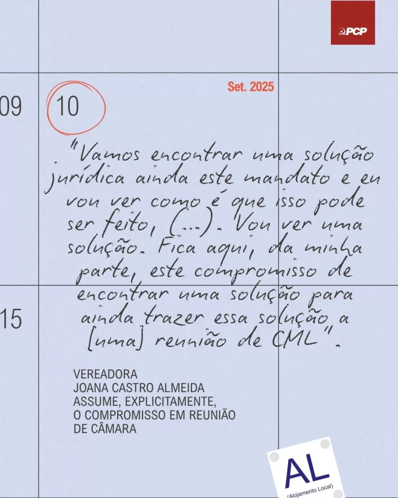 Na reunião de CML realizada no passado dia 10 de setembro, a Vereadora Joana Castro Almeida assume, explicitamente, o compromisso: “Vamos encontrar uma solução jurídica ainda este mandato e eu vou ver como é que isso pode ser feito, (…). Vou ver uma solução. Fica aqui, da minha parte, este compromisso de encontrar uma solução para ainda trazer essa solução a [uma] reunião de CML”.