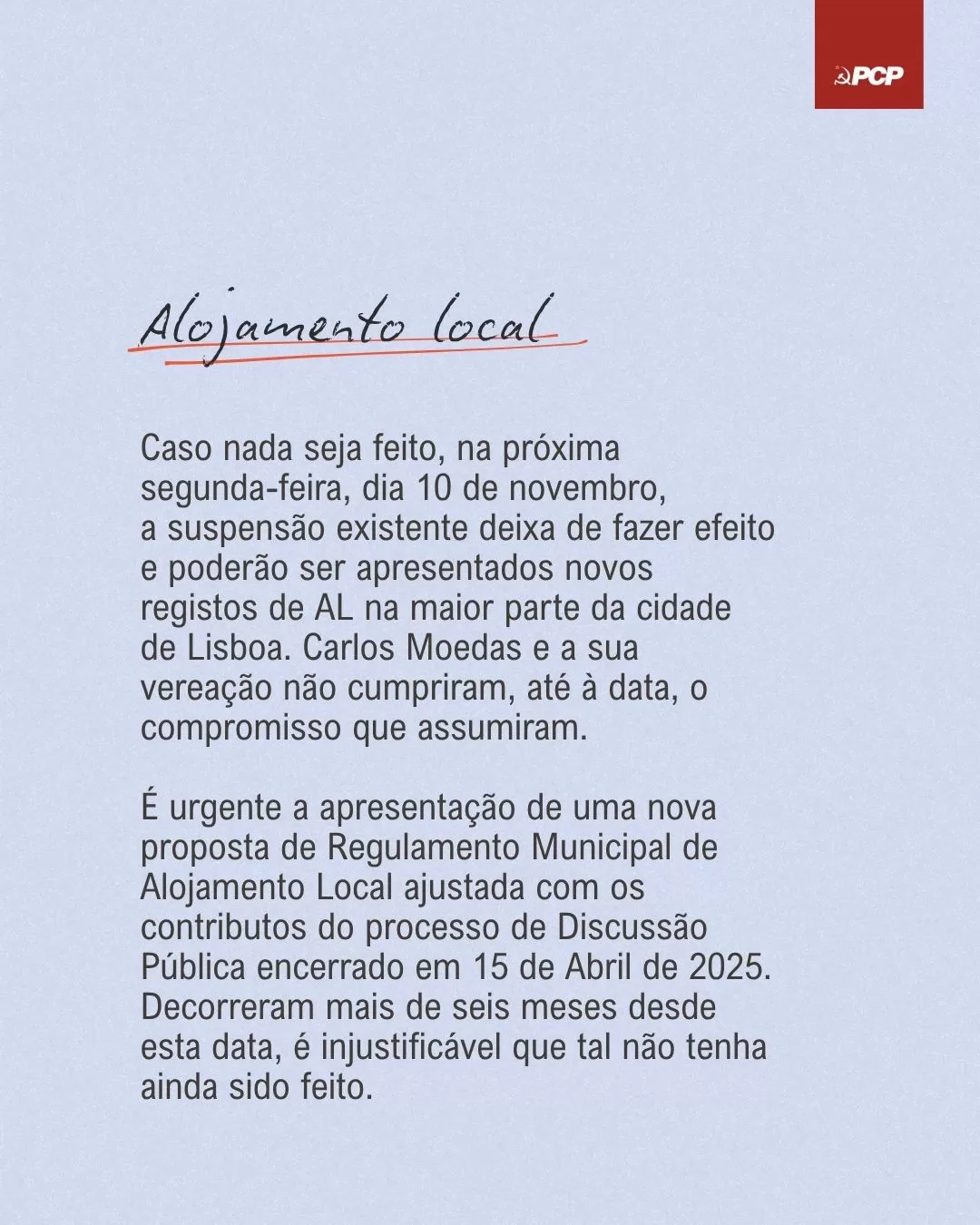 O que se exige é a apresentação urgente – ainda esta semana – da nova proposta de Regulamento Municipal de Alojamento Local ajustada com os contributos do processo de Discussão Pública encerrado em 15 de Abril de 2025. Decorreram mais de seis meses desde esta data, é injustificável que tal não tenha ainda sido feito.