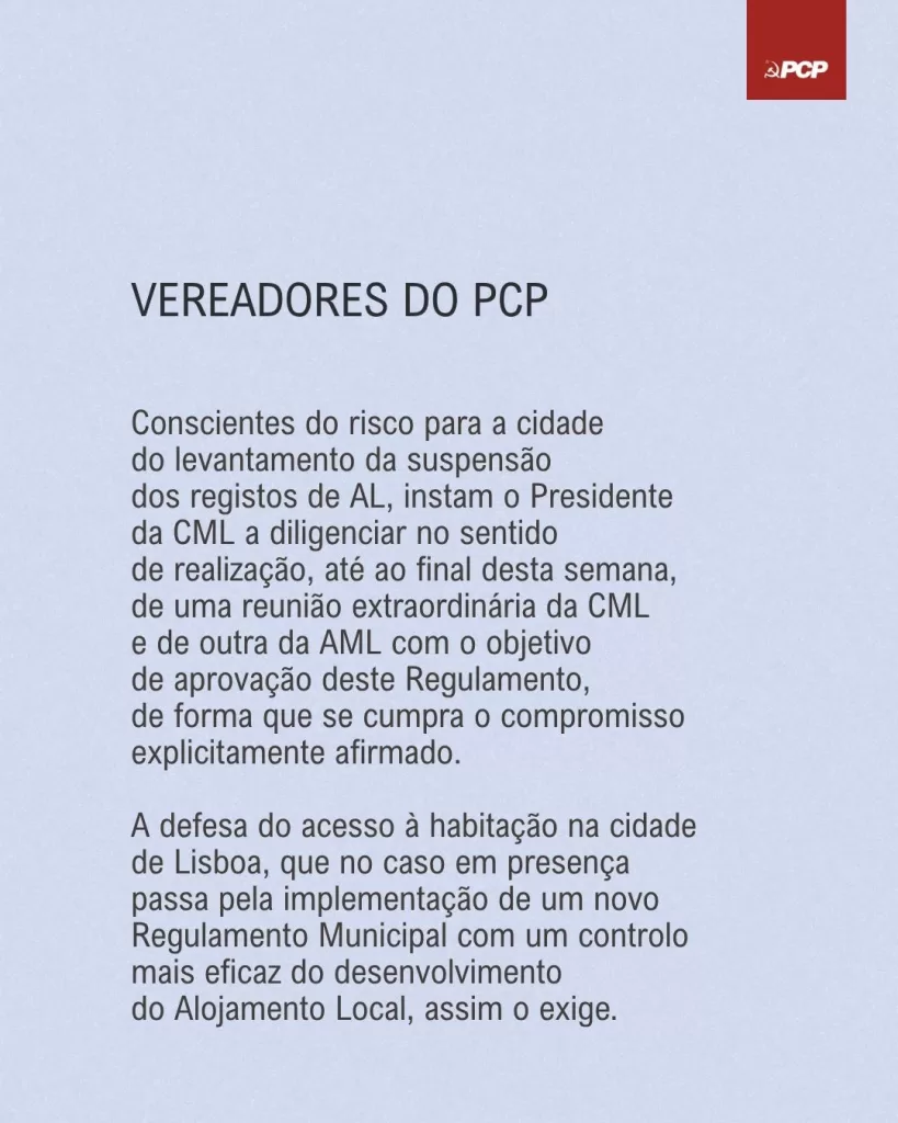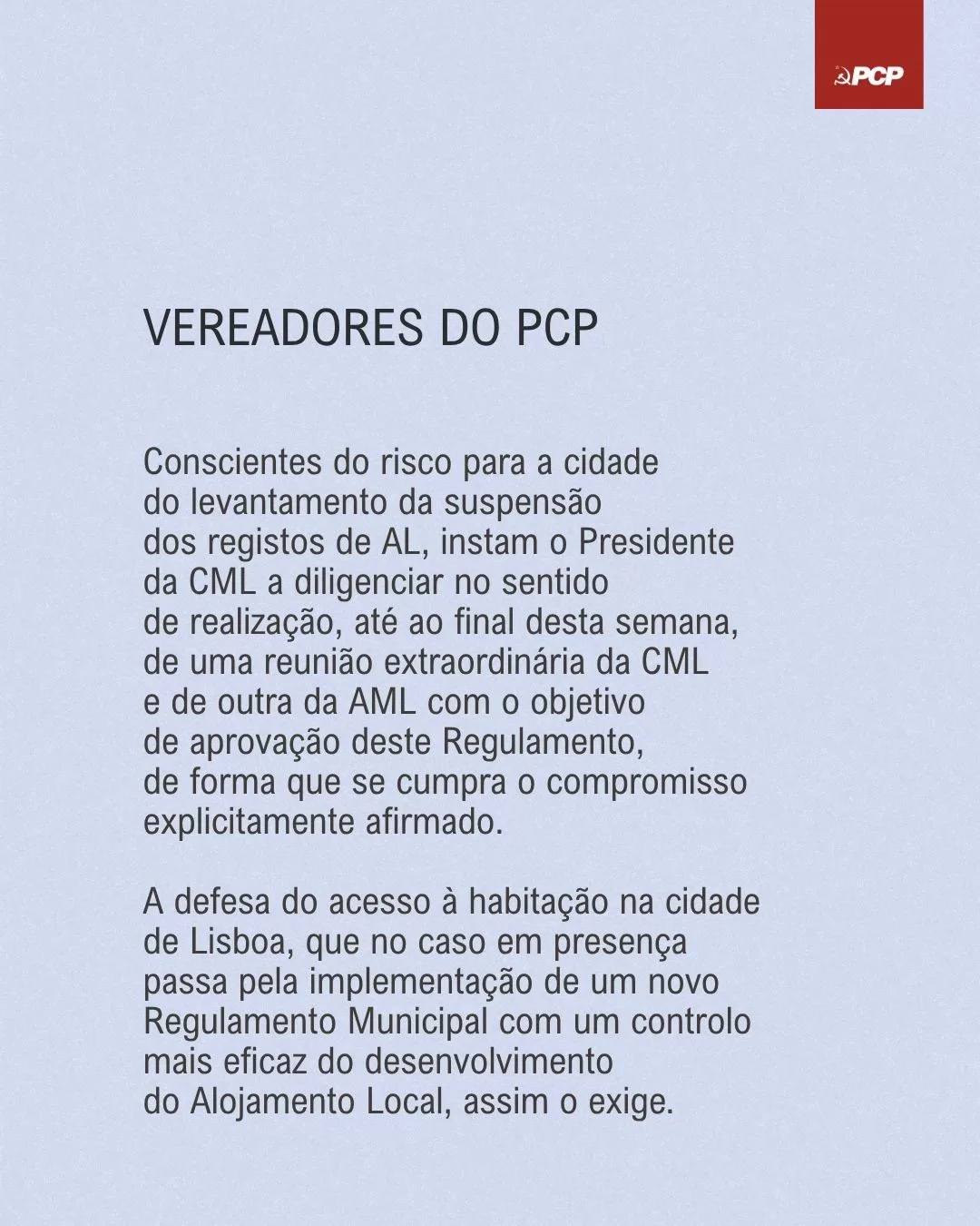 Conscientes do risco para a cidade do levantamento da suspensão dos registos de AL, os vereadores do PCP instam o Presidente da CML a diligenciar no sentido de realização, até ao final desta semana, de uma reunião extraordinária da CML e de outra da AML com o objetivo de aprovação deste Regulamento, de forma que se cumpra o compromisso explicitamente afirmado.