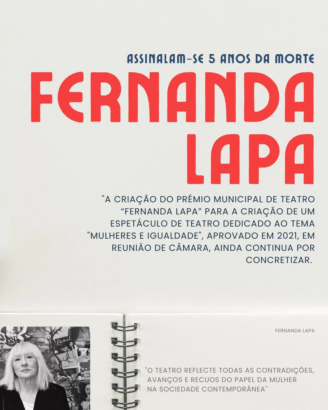 Nem PS/BE, no mandato anterior, nem PSD/CDS, neste mandato que agora termina, concretizaram a criação do Prémio Municipal de Teatro, proposto pela CDU, que homenagearia esta extraordinária mulher e contribuiria para a tão necessária reflexão em torno das questões da igualdade e do papel da mulher, problemáticas transversais a toda a sociedade.