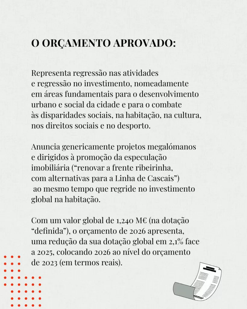 As grandes opções do plano (GOP´s) de 2026 enunciam genericamente projetos megalómanos e dirigidos à promoção da especulação imobiliária (“renovar a frente ribeirinha, com alternativas para a Linha de Cascais”) ao mesmo tempo que a proposta de Orçamento regride no investimento global na habitação.