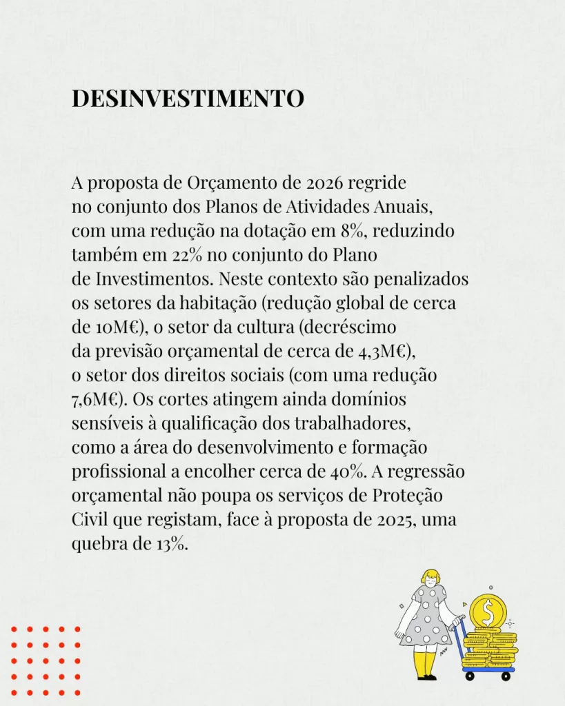 A proposta de Orçamento de 2026 regride no conjunto dos Planos de Atividades Anuais, uma redução na dotação em 8%, reduzindo também em 22% no conjunto do Plano de Investimentos. Neste contexto são penalizados os setores da Habitação (redução global de cerca de 10M€), o setor da Cultura (decréscimo da previsão orçamental de cerca de 4,3M€), o setor dos Direitos Sociais (com uma redução 7,6M€). Os cortes atingem ainda domínios sensíveis à qualificação dos trabalhadores, com a área do Desenvolvimento e Formação Profissional a encolher cerca de 40%. A regressão orçamental não poupa os serviços de Proteção Civil os quais registam face à proposta de 2025 uma quebra de 13%.