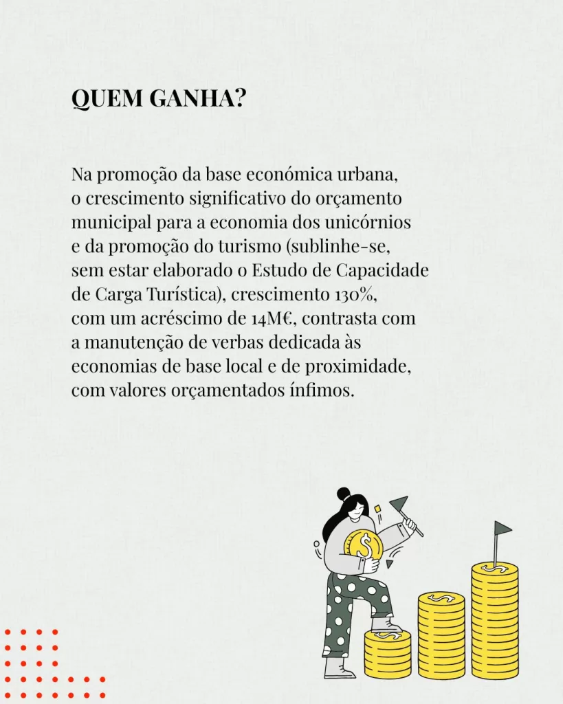 Na promoção da base económica urbana, o crescimento significativo do orçamento municipal para a economia dos unicórnios e da promoção do turismo (sublinhe-se, sem estar elaborado o Estudo de Capacidade de Carga Turística), crescimento 130%, com um acréscimo de 14M€, contrasta com a manutenção de verbas dedicada às economias de base local e de proximidade, com valores orçamentados ínfimos.