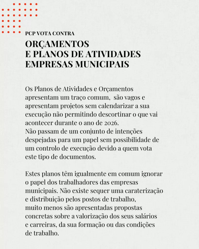 Quanto às empresas municipais, os Planos de Atividades e Orçamentos apresentam um traço comum, na generalidade são vagos e apresentam projetos sem calendarizar a sua execução não permitindo descortinar o que vai acontecer durante o ano de 2026. Não passam de um conjunto de intenções despejadas para um papel sem possibilidade de um controlo de execução devido a quem vota este tipo de documentos.