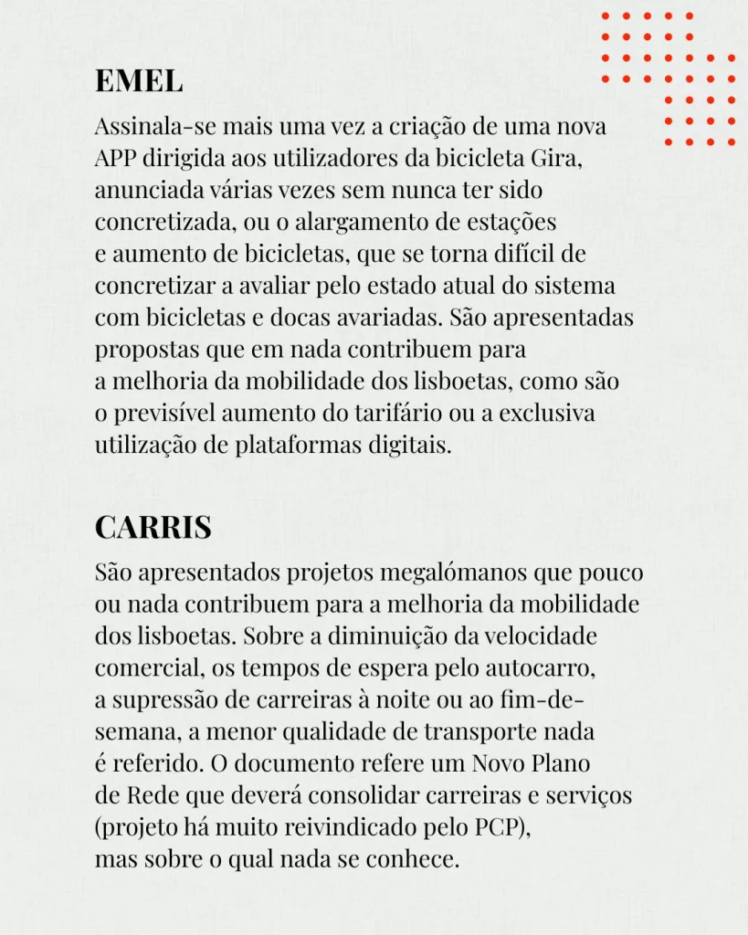 Para a CARRIS são apresentados projetos megalómanos que pouco ou nada contribuem para a melhoria da mobilidade dos lisboetas. Sobre a diminuição da velocidade comercial, os tempos de espera pelo autocarro, a supressão de carreiras à noite ou ao fim-de-semana, a menor qualidade de transporte, nada é referido. O documento refere um Novo Plano de Rede que deverá consolidar carreiras e serviços (projeto há muito reivindicado pelo PCP), mas sobre o qual nada se conhece.
