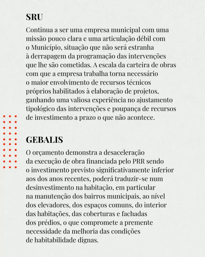 A GEBALIS, cujo orçamento demonstra a desaceleração da execução de obra financiada pelo PRR sendo o investimento previsto significativamente inferior aos dos anos recentes, poderá traduzir-se num desinvestimento na habitação, em particular na manutenção dos bairros municipais, ao nível dos elevadores, dos espaços comuns, do interior das habitações, das coberturas e fachadas dos prédios, o que compromete a premente necessidade da melhoria das condições de habitabilidade dignas.