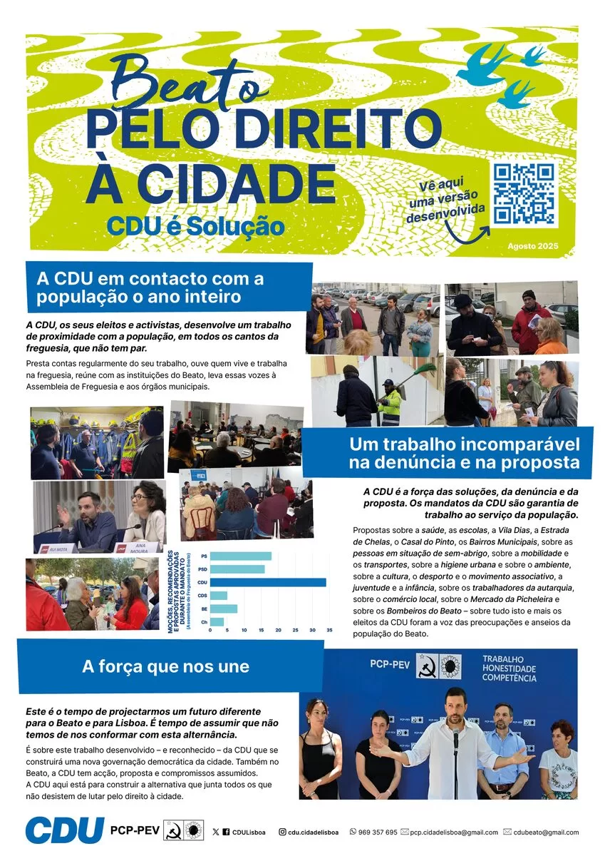 A CDU presta contas do seu trabalho no Beato, com a última edição do seu presta-contas deste mandato. Além de uma perspectiva geral do trabalho desenvolvido nestes últimos quatro anos, disponibiliza igualmente de forma sistemática toda a documentação relevante referente ao trabalho desenvolvido pela CDU na freguesia do Beato.
