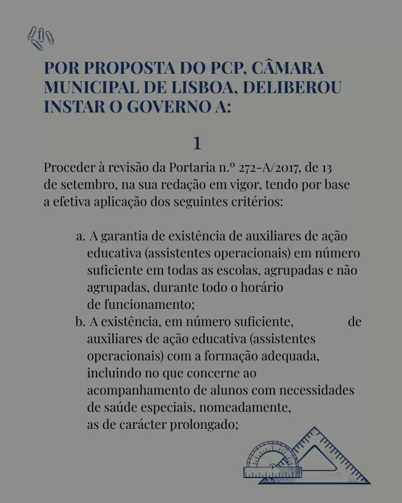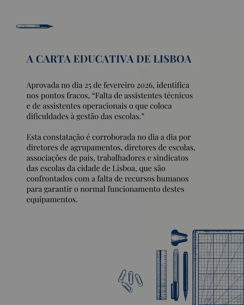 A Carta Educativa de Lisboa, aprovada no dia 25 de fevereiro 2026, identifica nos pontos fracos, “Falta de assistentes técnicos e de assistentes operacionais o que coloca dificuldades à gestão das escolas.”
