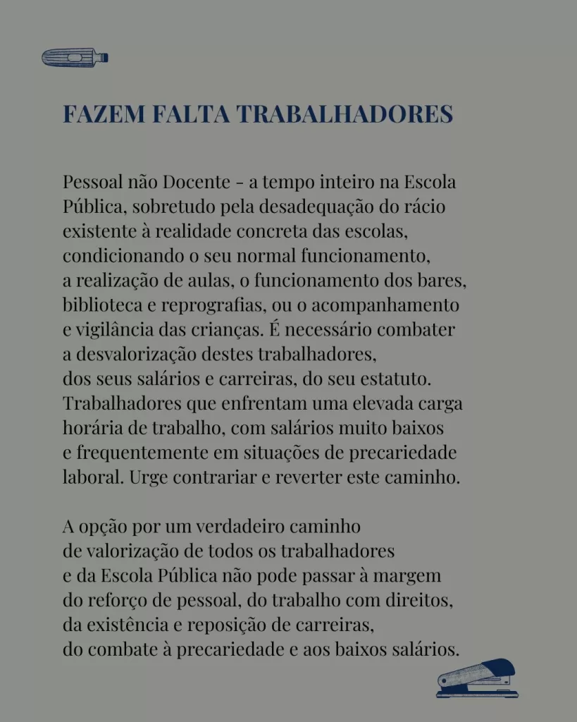 Fazem falta trabalhadores – Pessoal não Docente – a tempo inteiro na Escola Pública, sobretudo pela desadequação do rácio existente à realidade concreta das escolas, condicionando o seu normal funcionamento, a realização de aulas, o funcionamento dos bares, biblioteca e reprografias, ou o acompanhamento e vigilância das crianças. É necessário combater a desvalorização destes trabalhadores, dos seus salários e carreiras, do seu estatuto. Trabalhadores que enfrentam uma elevada carga horária de trabalho, com salários muito baixos e frequentemente em situações de precariedade laboral. Urge contrariar e reverter este caminho.