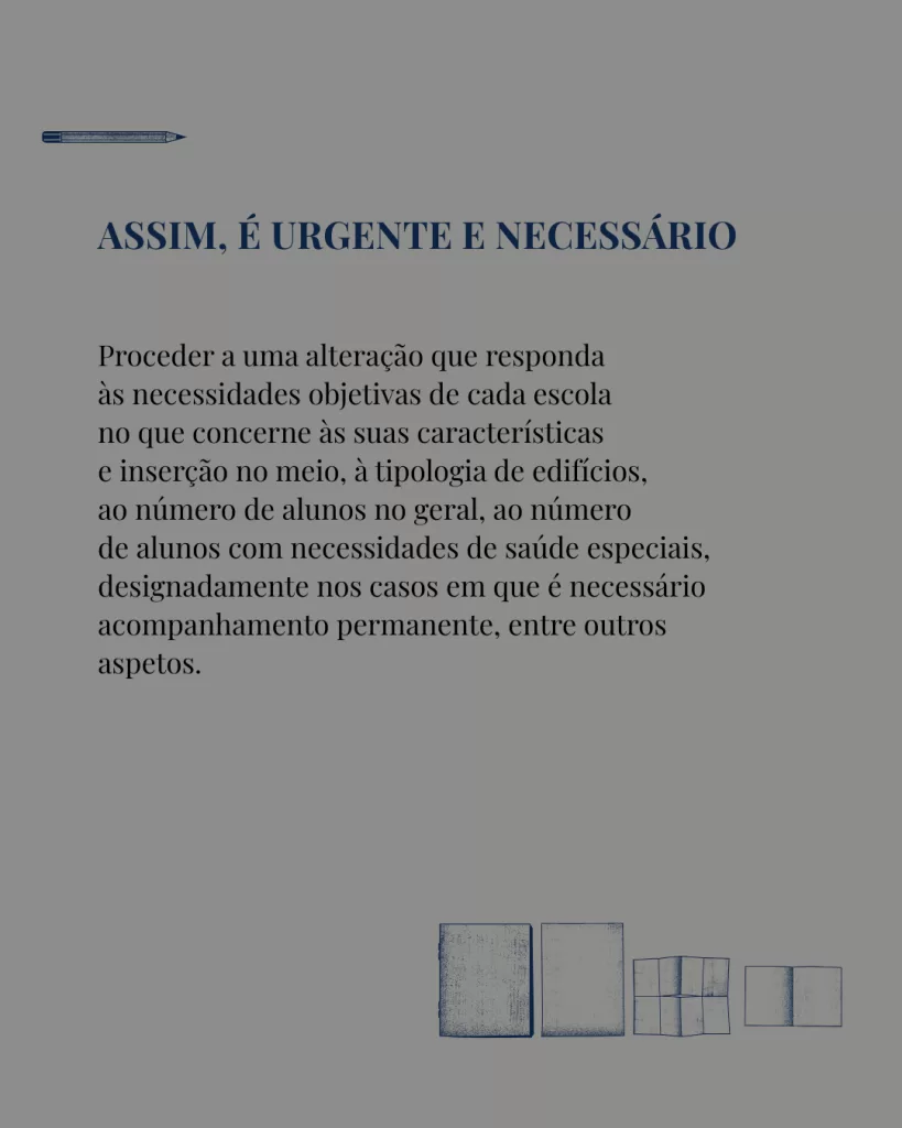 Assim, é urgente e necessário proceder a uma alteração que responda às necessidades objetivas de cada escola no que concerne às suas características e inserção no meio, à tipologia de edifícios, ao número de alunos no geral, ao número de alunos com necessidades de saúde especiais, designadamente nos casos em que é necessário acompanhamento permanente, entre outros aspetos.