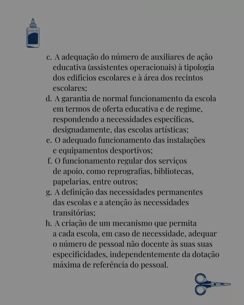 8. A criação de um mecanismo que permita a cada escola, em caso de necessidade, adequar o número de pessoal não docente às suas suas especificidades, independentemente da dotação máxima de referência do pessoal.