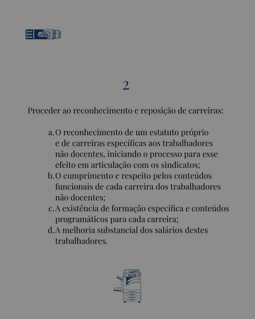 1. O reconhecimento de um estatuto próprio e de carreiras específicas aos trabalhadores não docentes, iniciando o processo para esse efeito em articulação com os sindicatos;