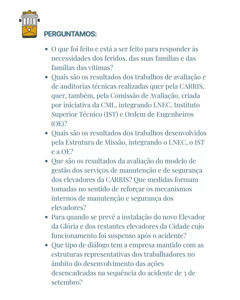 Decorrido este tempo após um dos mais trágicos acidentes registados na cidade de Lisboa envolvendo uma das suas emblemáticas infraestruturas de mobilidade – o Elevador da Glória – impõe-se a prestação de contas por parte de Carlos Moedas sobre vários aspetos da evolução da resolução de questões que resultaram do acidente.