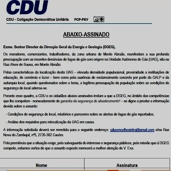 A CDU está a promover junto da população um abaixo-assinado dirigido à Direcção Geral da Energia e Geologia sobre as condições de segurança da Unidade Autónoma de Gás localizada entre a Rua Alves de Sousa e a Rua do Monte, em Monte Abraão.