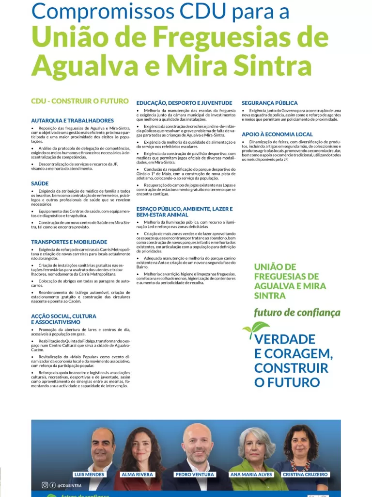 Agualva e Mira-Sintra Sintra Programa Eleitoral. Agualva e Mira Sintra. Joana Marques4 de Outubro de 2025 Autárquicas 2025CDU Verdade e Coragem para Construir o Futuro. PARTILHAR Facebook Twitter Email Whatsapp Messenger