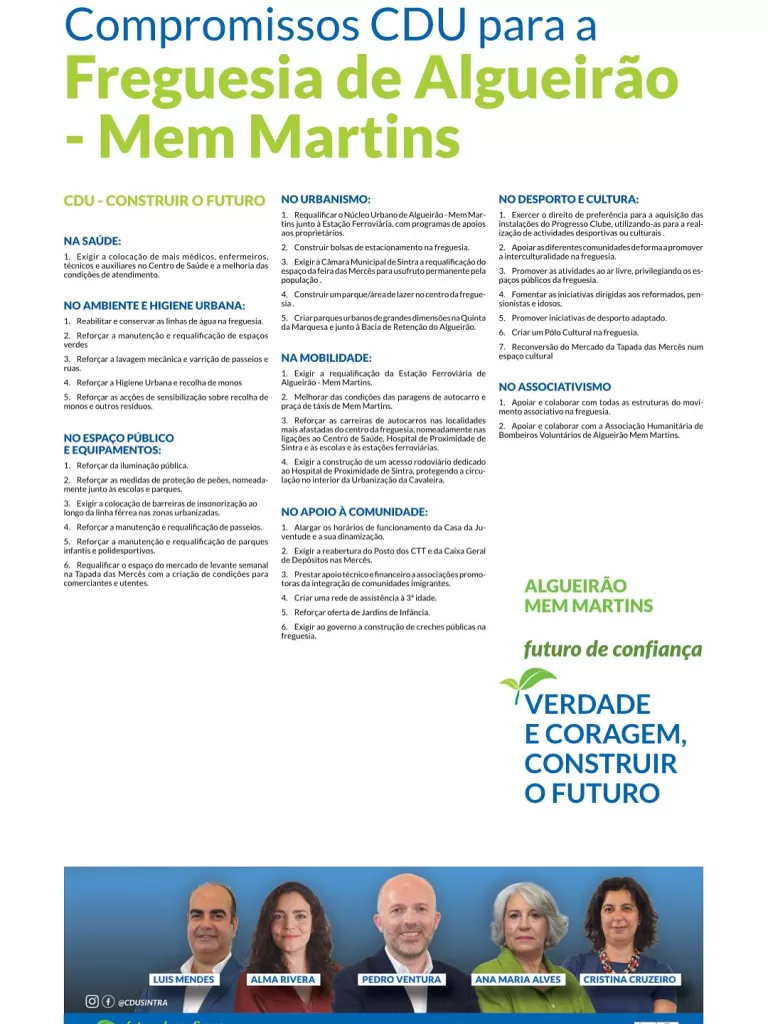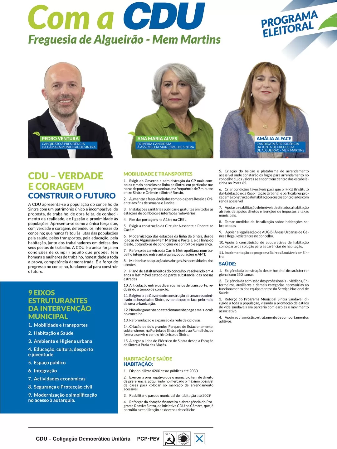 Algueirão Mem-Martins Sintra Programa Eleitoral. Algueirão – Mem Martins. Joana Marques4 de Outubro de 2025 Autárquicas 2025CDU Verdade e Coragem para Construir o Futuro. PARTILHAR Facebook Twitter Email Whatsapp Messenger