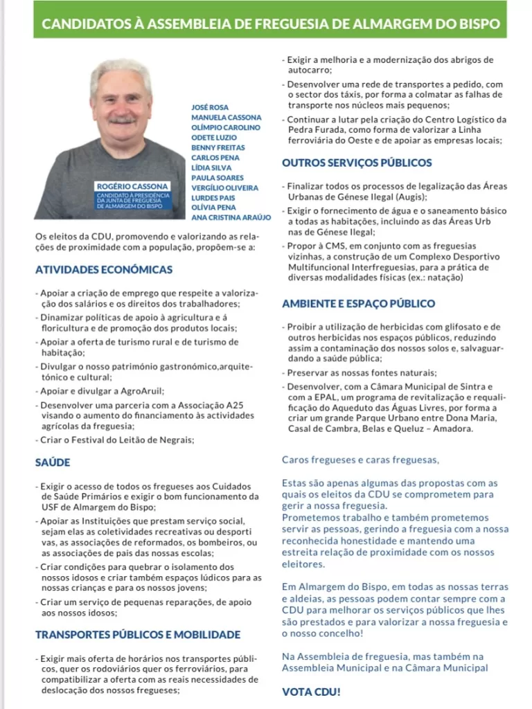 Almargem do Bispo, Montelavar e Pêro Pinheiro Sintra Programa Eleitoral. Almargem do Bispo. Joana Marques4 de Outubro de 2025 Autárquicas 2025CDU Verdade e Coragem para Construir o Futuro. PARTILHAR Facebook Twitter Email Whatsapp Messenger