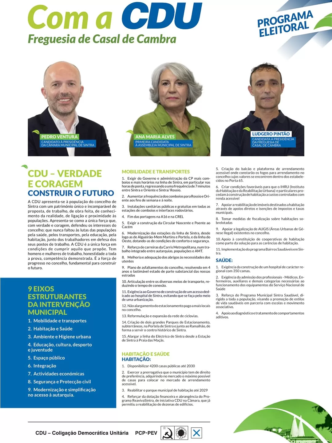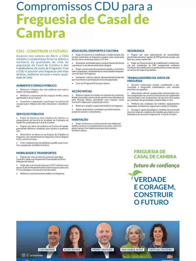 Casal de Cambra Sintra Programa Eleitoral. Casal de Cambra. Joana Marques5 de Outubro de 2025 Autárquicas 2025CDU Verdade e Coragem para Construir o Futuro. PARTILHAR Facebook Twitter Email Whatsapp Messenger