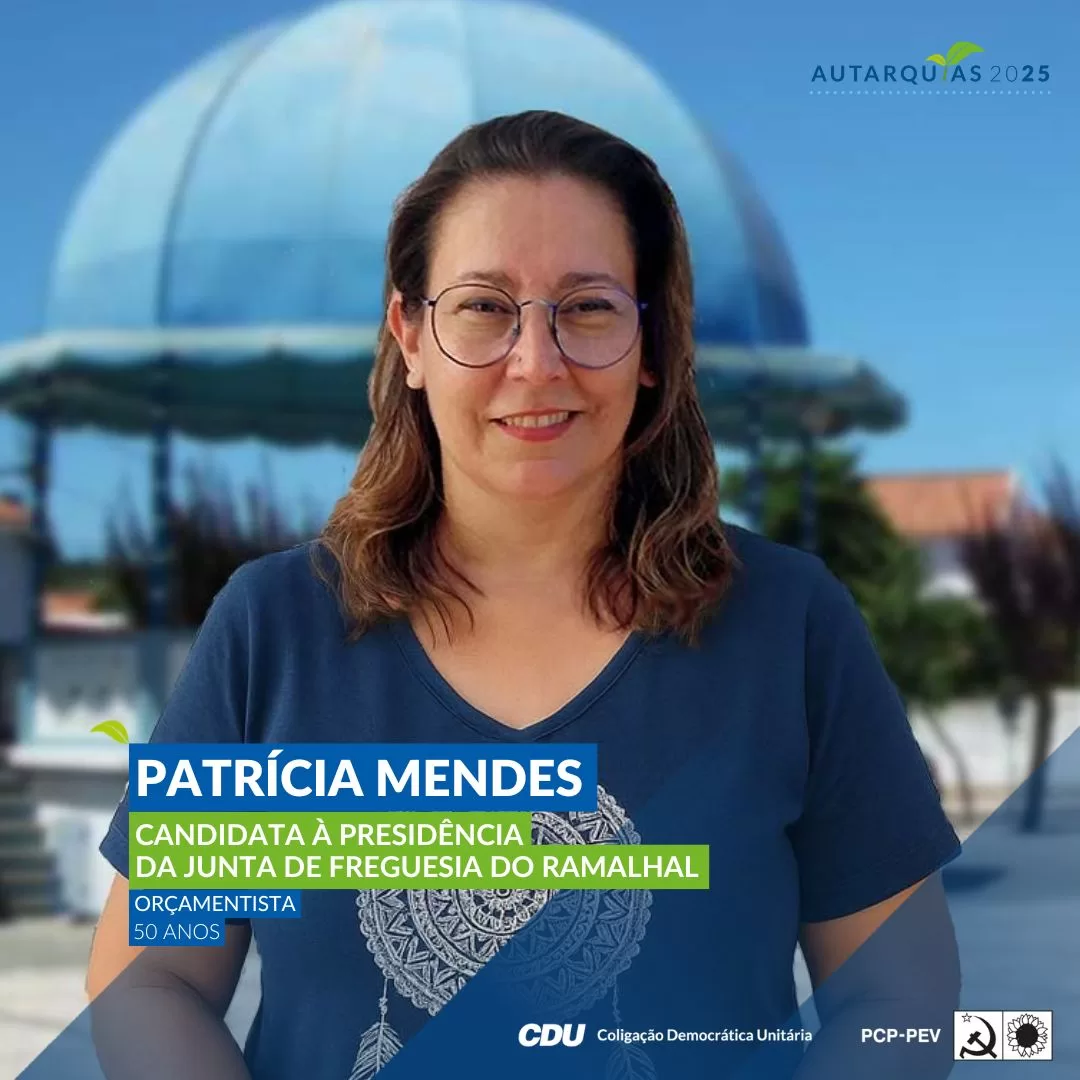 Patrícia Mendes é a primeira candidata na lista da CDU à Junta de Freguesia do Ramalhal, com as ideias-base do seu programa a tocarem as áreas das zonas verdes, ambiente e saneamento, transparência e proximidade, movimento associativo, juventude, desporto e cultura, infraestruturas e acessibilidades.