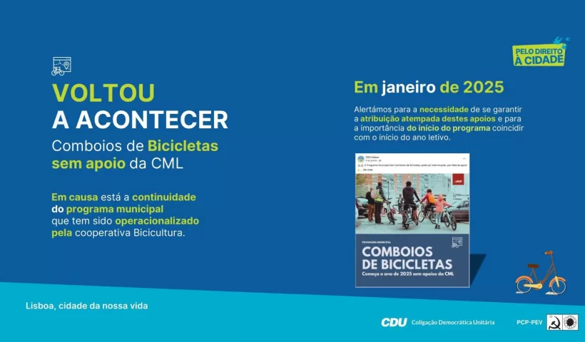 Voltou a acontecer, comboios de Bicicletas sem apoio da CML. Em causa está a continuidade do programa municipal que tem sido operacionalizado pela cooperativa Bicicultura.…